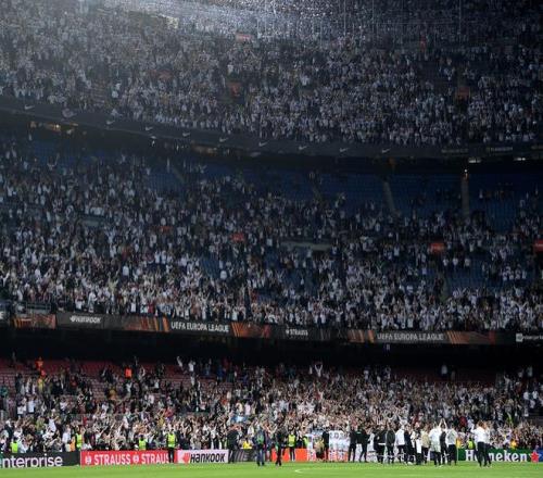 而在塞维利亚举办的决赛,远征的规模达到了令人瞠目的顶点:约12万球迷涌入城市,将决赛地变为法兰克福的第二主场,俱乐部主席彼得-费舍尔那句“我们有19万远征球迷都没办法挤进这个米奇妙妙屋球场”的调侃,道出了这种忠诚的甜蜜负担。法兰克福死忠球迷花费5万欧元制作了巨型Tifo,全部设备和工具甚至用了7辆卡车才从波兰被运往塞维利亚,不计成本地为球队制造了十足的压迫感。球队也没有辜负球迷们的热切期待,点球击败格拉斯哥流浪者,时隔42年再度欧战称王。
