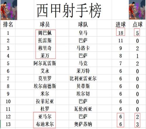 射手榜方面,姆巴佩点射建功,18球稳居榜首,托雷斯11球位列第2。穆里奇9球第3,莱万8球第4。布迪米尔今天梅开二度后,追上亚马尔,埃尔南德斯,米尔,拉菲尼亚等人6球刚好挤入前十。